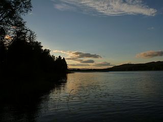 Die ersten hundert Meter paddelten wir kreuz und quer, bis wir uns auf das Kanu eingestimmt hatten. Als wir den Dreh raus hatten, paddelten wir noch ungefähr vier Kilometer, was ungefähr einem Drittel des Sees entsprach. Dann entschlossen wir uns, weil es auch schon später Nachmittag war, unser Nachtlager auf einer der Inseln im See aufzuschlagen. Auf einer langen Insel, die einen Buckel, der sich in der Mitte aber absenkte, hatte, gingen wir an Land und errichteten das Zelt. Dann brieten wir uns ein Fleisch und nach dem Essen besichtigten wir die Nord- und die Südspitze der Insel. Wir hatten von dort aus einen wunderbaren Blick über den abendlichen See. Und ein paar Heidelbeeren gab es auch noch zu finden. Dann begaben wir uns ins Zelt, um noch ein wenig zu lesen und kurz darauf einzuschlafen.